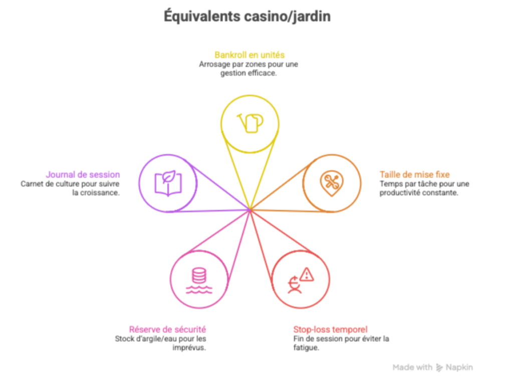 | Principe casino | Équivalent jardin/atelier | Application pratique |