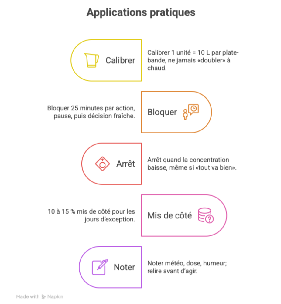 | Bankroll en unités | Arrosage par zones | Calibrer 1 unité = 10 L par plate-bande, ne jamais «doubler» à chaud |